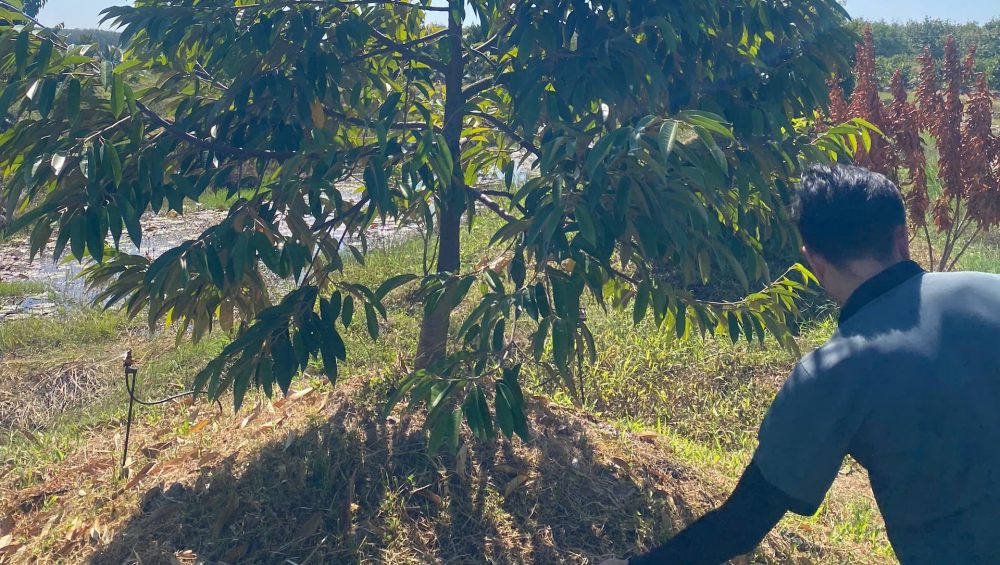 Thời gian qua mưa nhiều liên tục, vườn bị ngập úng kéo dài đồng thời đất lại có hiện tượng nhiễm phèn. Trên tán, do không phun thuốc kịp thời nên lá bị nhện tấn công, làm khô mép, bạc lá và chậm phát triển.
