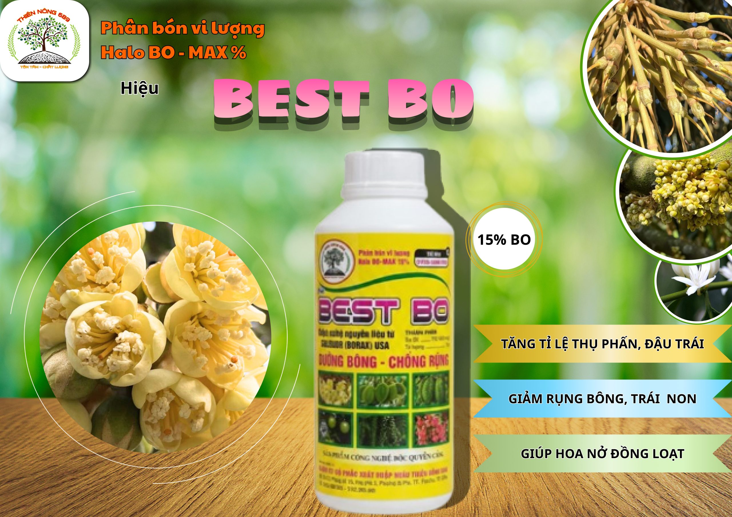 BEST BO là sản phẩm của Thiên Nông 689, được nghiên cứu và phát triển dựa trên vai trò then chốt của Bo trong phân hóa mầm hoa và thụ phấn, nhằm cung cấp Bo hàm lượng cao, dễ hấp thu, giúp cây trồng bước vào giai đoạn sinh thực đúng thời điểm và đạt hiệu quả cao.